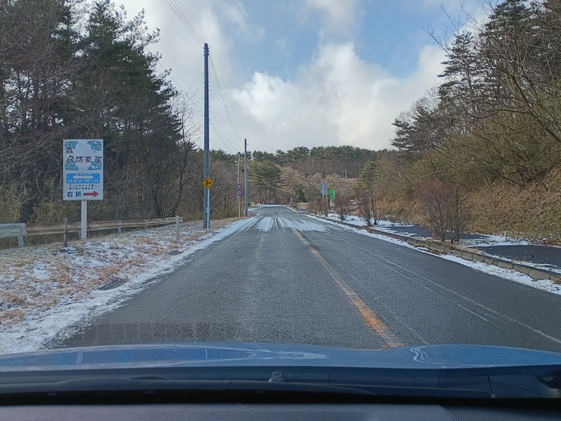 途中の道路状況:路面は日陰部分で凍結しています。運転には注意が必要です。スタッドレスタイヤ、チェーンの準備をお願いします。