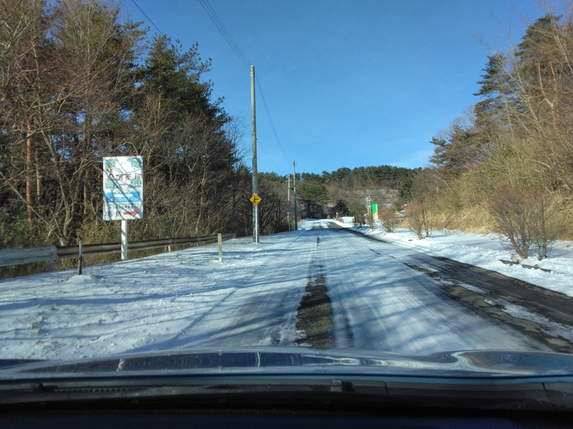 途中の道路状況:路面は日陰で凍結、シャーベットの状態です。夕方から気温が下がるとさらに凍結する心配がありますので、運転には注意が必要です。スタッドレスタイヤでお越しください。