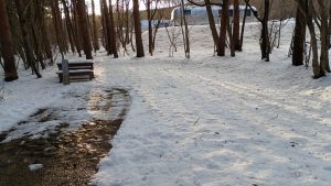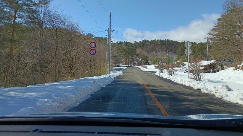 途中の道路状況:道脇に除雪した雪がありますが、路面に雪はありません。